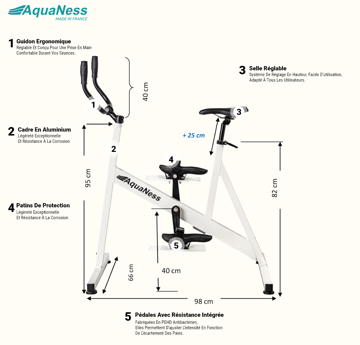 Les vélos de piscine AquaNess sont destinés aussi bien aux sportifs confirmés qu'aux particuliers souhaitant reprendre une activité physique, aux personnes en surpoids ou en convalescence. Avec son système de frein régulé et son niveau de résistance élevé, le vélo de piscine Aquaness V2 est l'allier idéal des sportifs les plus exigeants. Le ressort de compensation permet de faire pression sur le frein en résine qui créée une résistance sur le disque en aluminium anodisé.