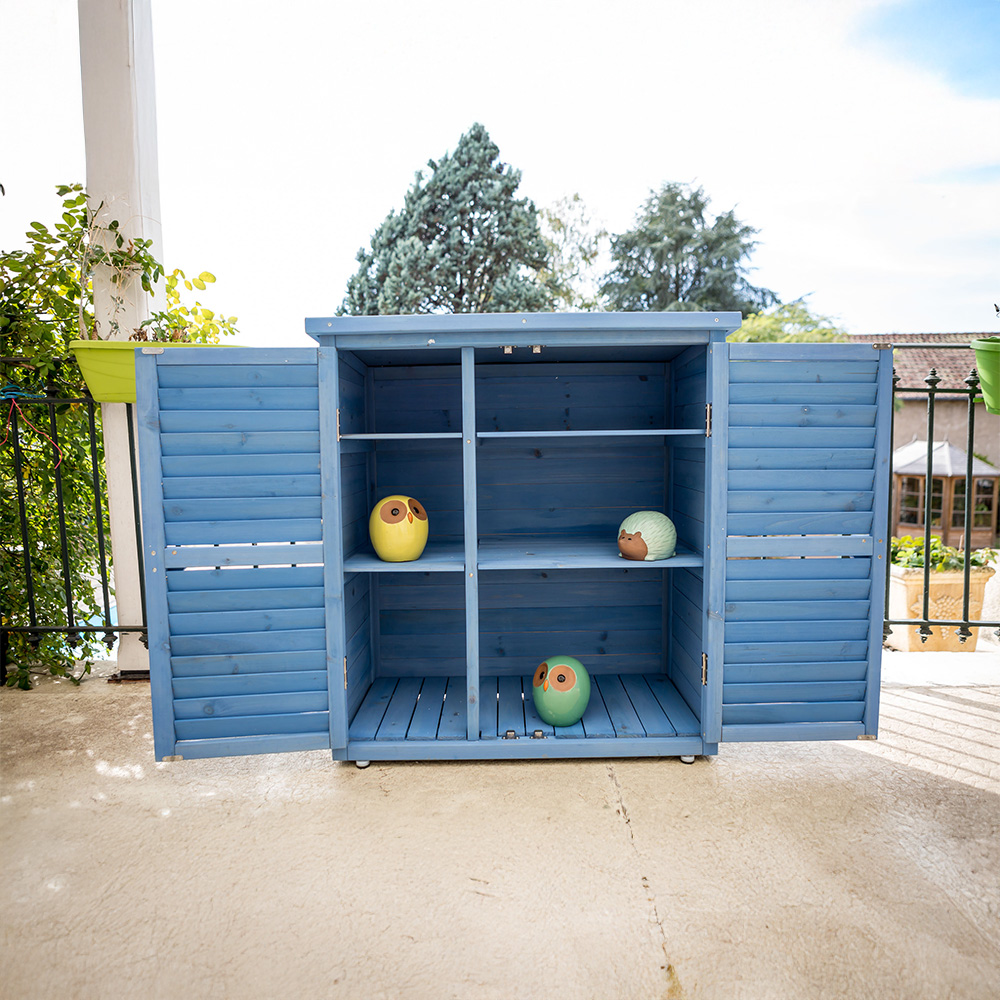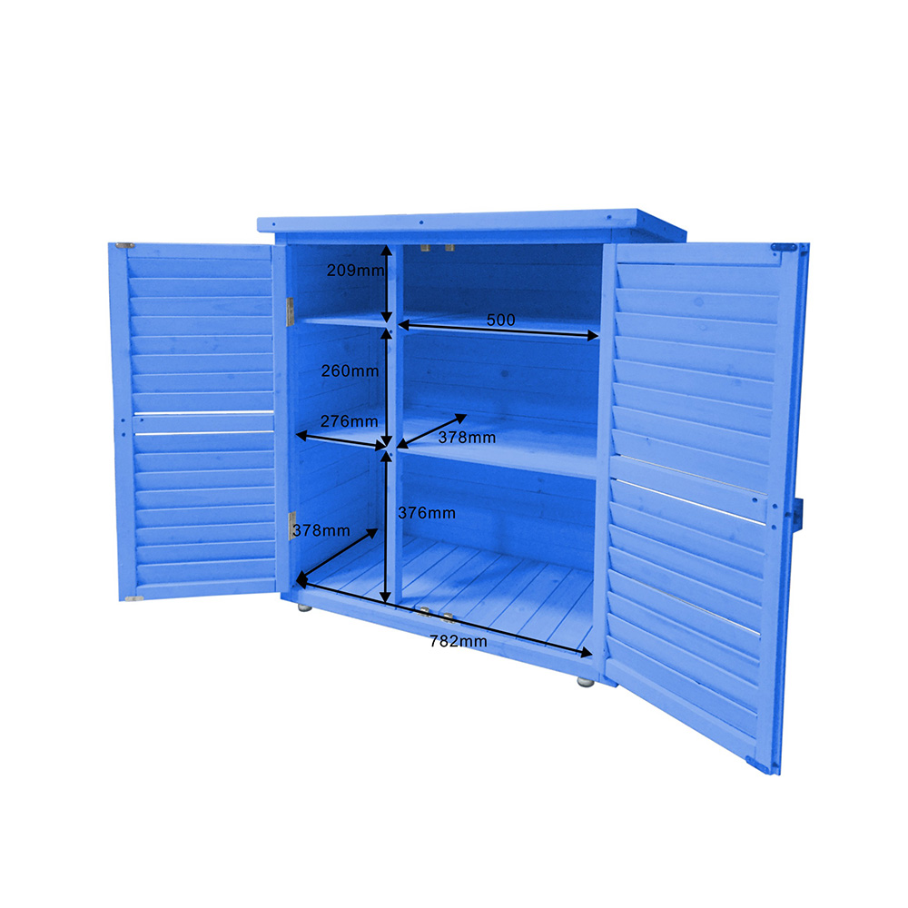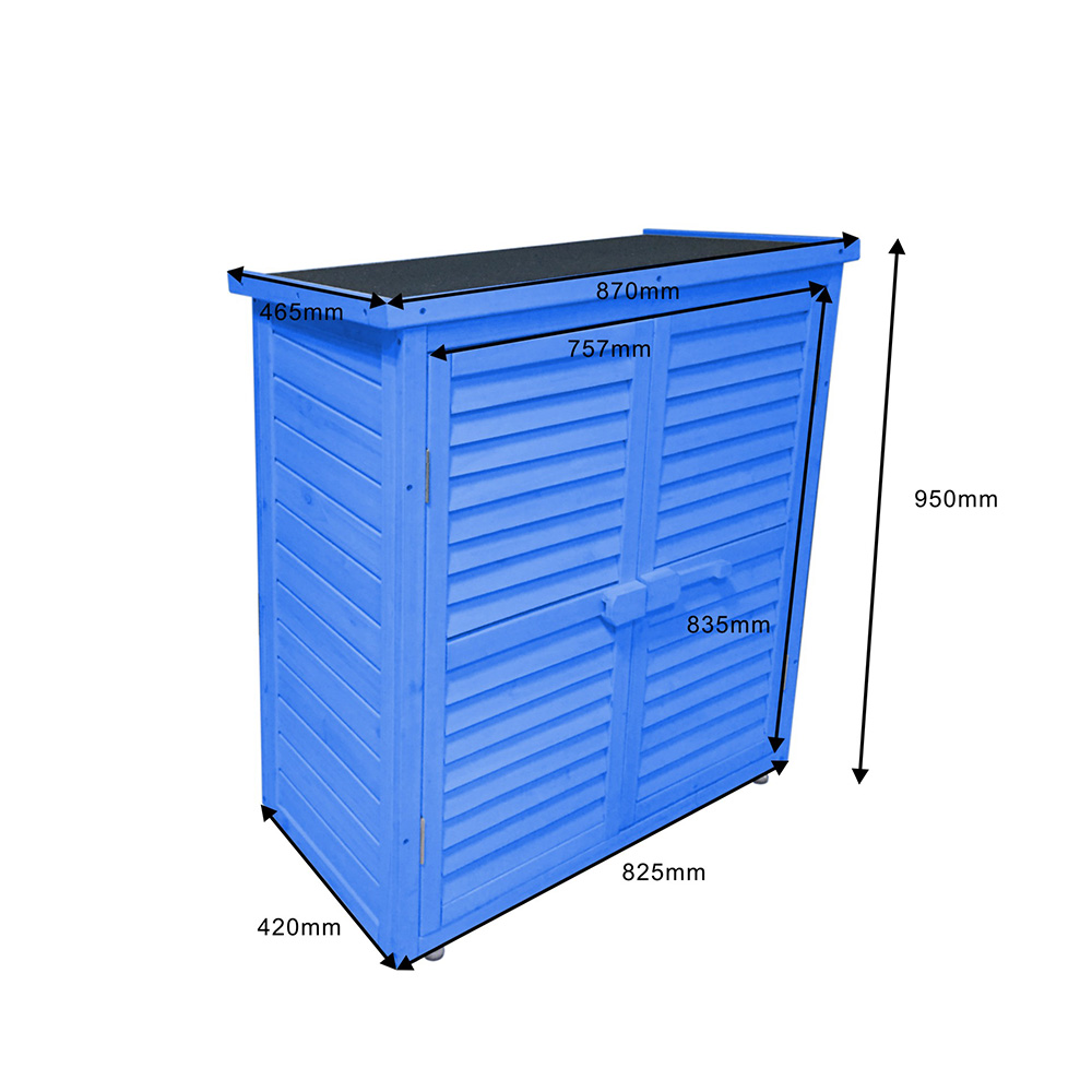Optimisez votre rangement extérieur avec l’armoire basse BOX 0905 : structure bois 10 mm lasuré bleu, 2 portes persiennées et 2 étagères pour un volume utile de 0,25 m³. Le toit bitumé protège des intempéries, la peinture est résistante à l’eau et l’ensemble se monte facilement à la vis. Produit FSC 100%, RoHS, 15 kg, 87 × 46,5 × 95 cm, garantie 2 ans. Idéal balcon, terrasse et abris de jardin.
