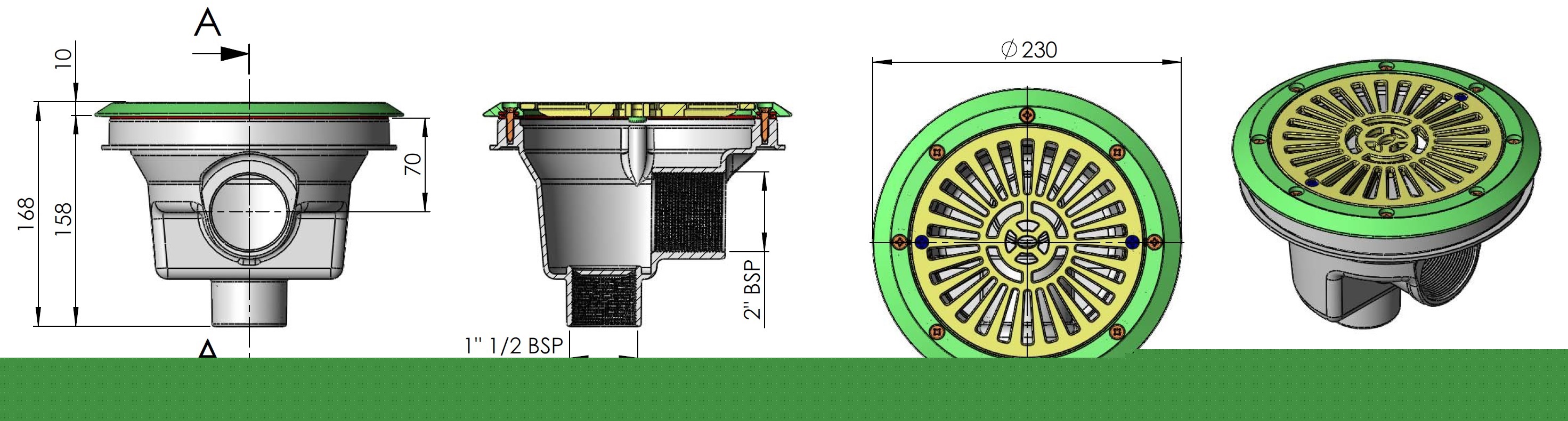 Elle possède une sortie latérale 2" et une sortie inférieure 1"1/2 (sortie inférieure fermée). Possibilité également de montage d'un tube de drainage.