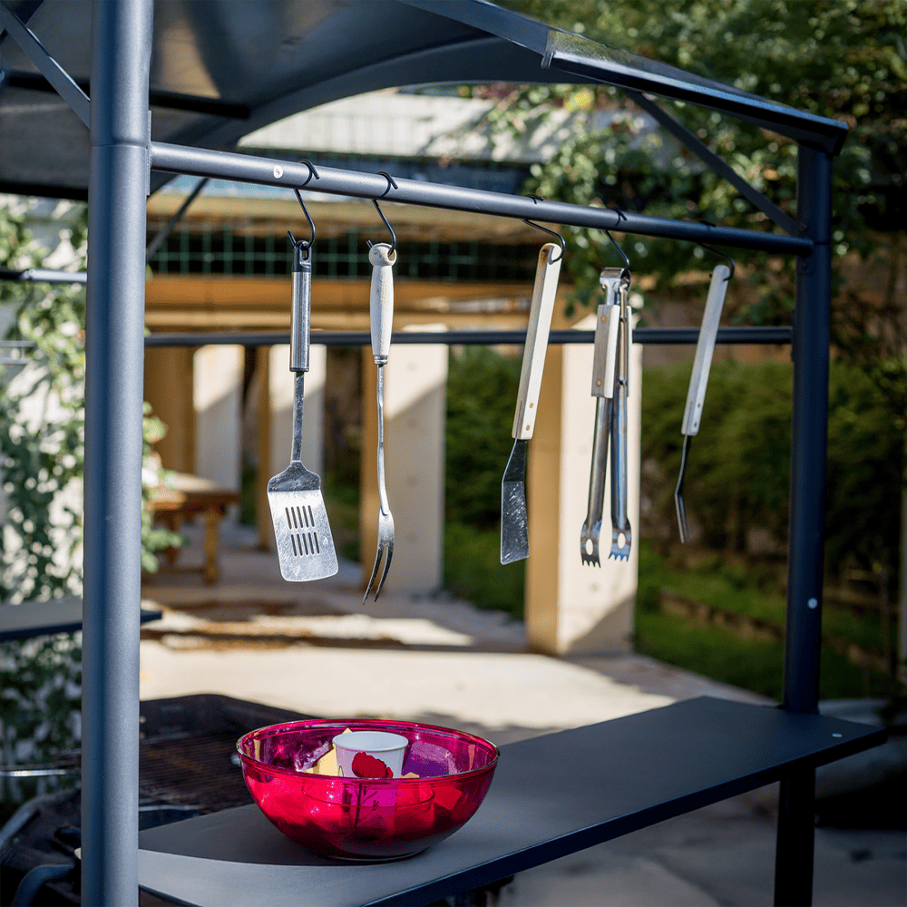 Carport barbecue finition époxy gris / toit réalisé en acier / pieds à rattrapage de niveau et accessoires barbecue