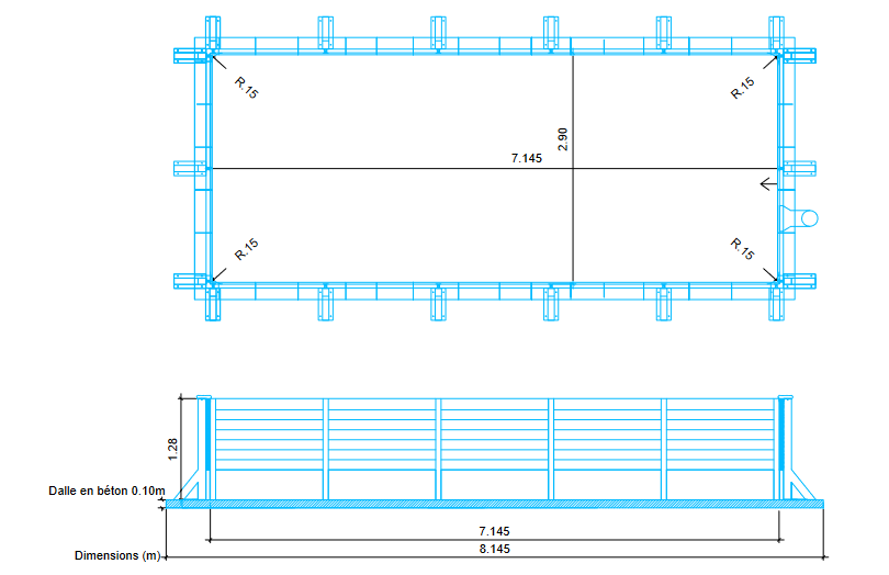 Sa structure solide, entièrement en béton avec des traverses et piliers, est complétée par une margelle en béton teinté et un support intérieur de 4 mm, assurant une stabilité maximale.