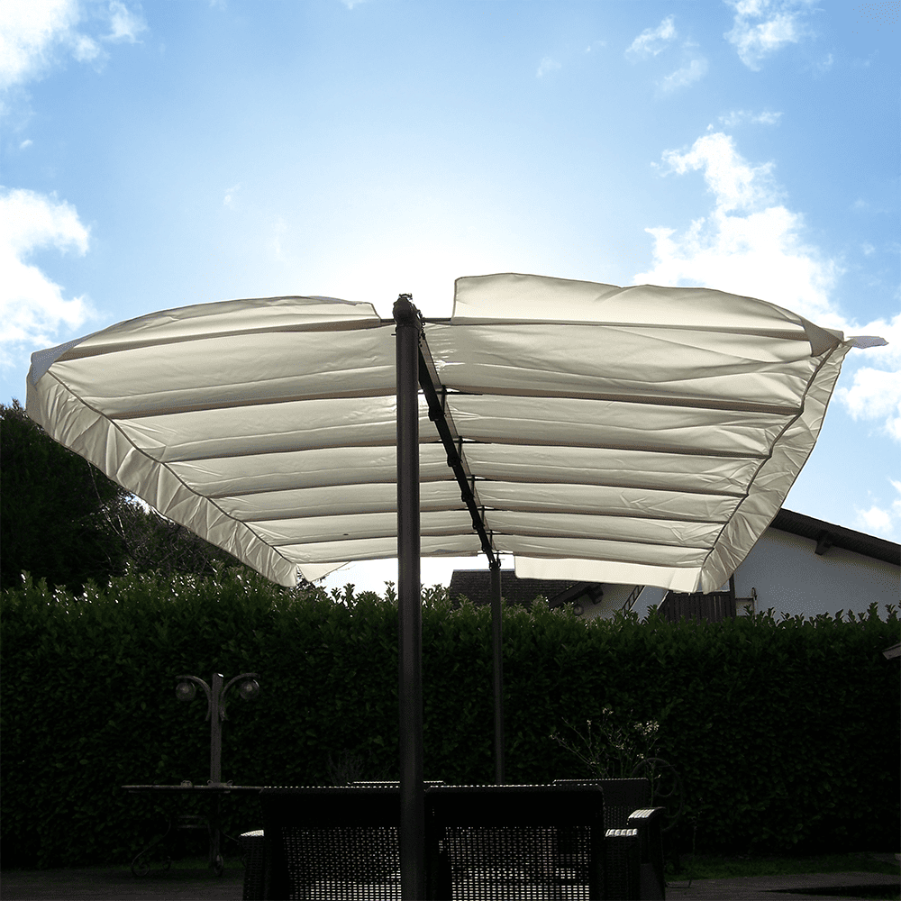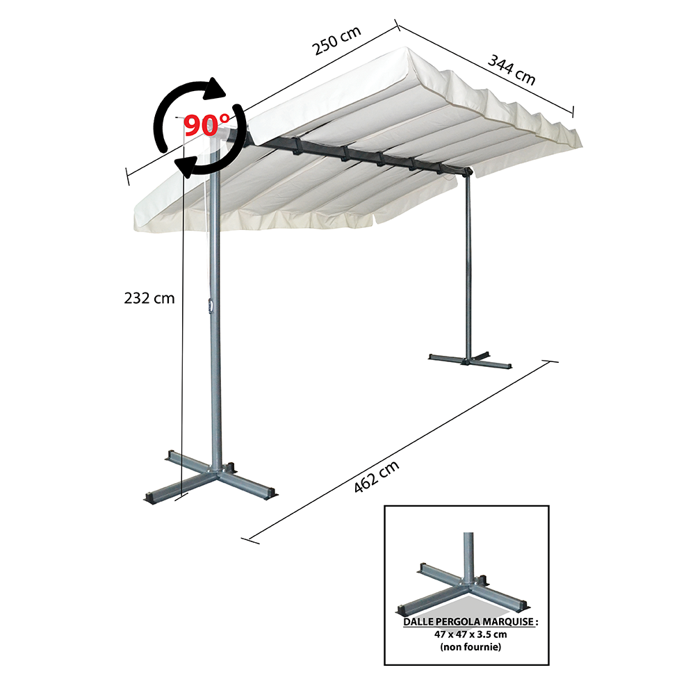 La pergola marquise PER 2535 M (3,60 × 2,50 m) offre une protection 9 m² idéale pour terrasse, piscine ou jardin. Sa toile polyester 200 g/m² écru, double pente et pivotante à 90° avec extension latérale réglable, s’ouvre et se replie en quelques secondes. Structure acier + barre centrale alu, pieds en croix compatibles contre-poids, montage facile à 2 personnes. Dimensions hors-tout 462 × 250 × 232 cm, garantie 2 ans structure / 1 an toile.