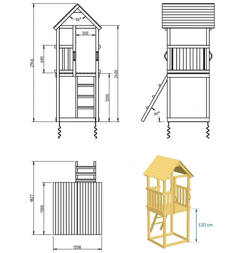 Epicéa FSC Traité en autoclave Cl. III. Hauteur de plateforme 120 cm. Ensemble comprenant : Structure avec bac à sable. Toboggan Vert pomme avec système de ruissellement d'eau. Conforme aux normes Européennes.